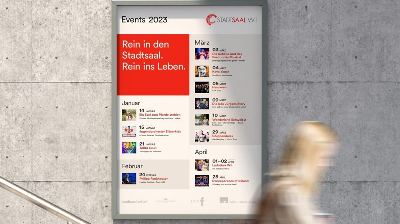 Die Vielfalt des Stadtsaal Wil spürt man im neuen Markenauftritt. Basierend auf einem Markenworkshop haben wir die Leitidee „Stadtsaal Wil – Wo Menschen zusammenkommen“ entwickelt. Das Design zeichnet sich aus durch farbenfrohe Visuals und eine präzise Sprache. und macht Lust, einen Ausflug nach Wil zu unternehmen, sei es für ein Seminar oder einen Samstagabend.