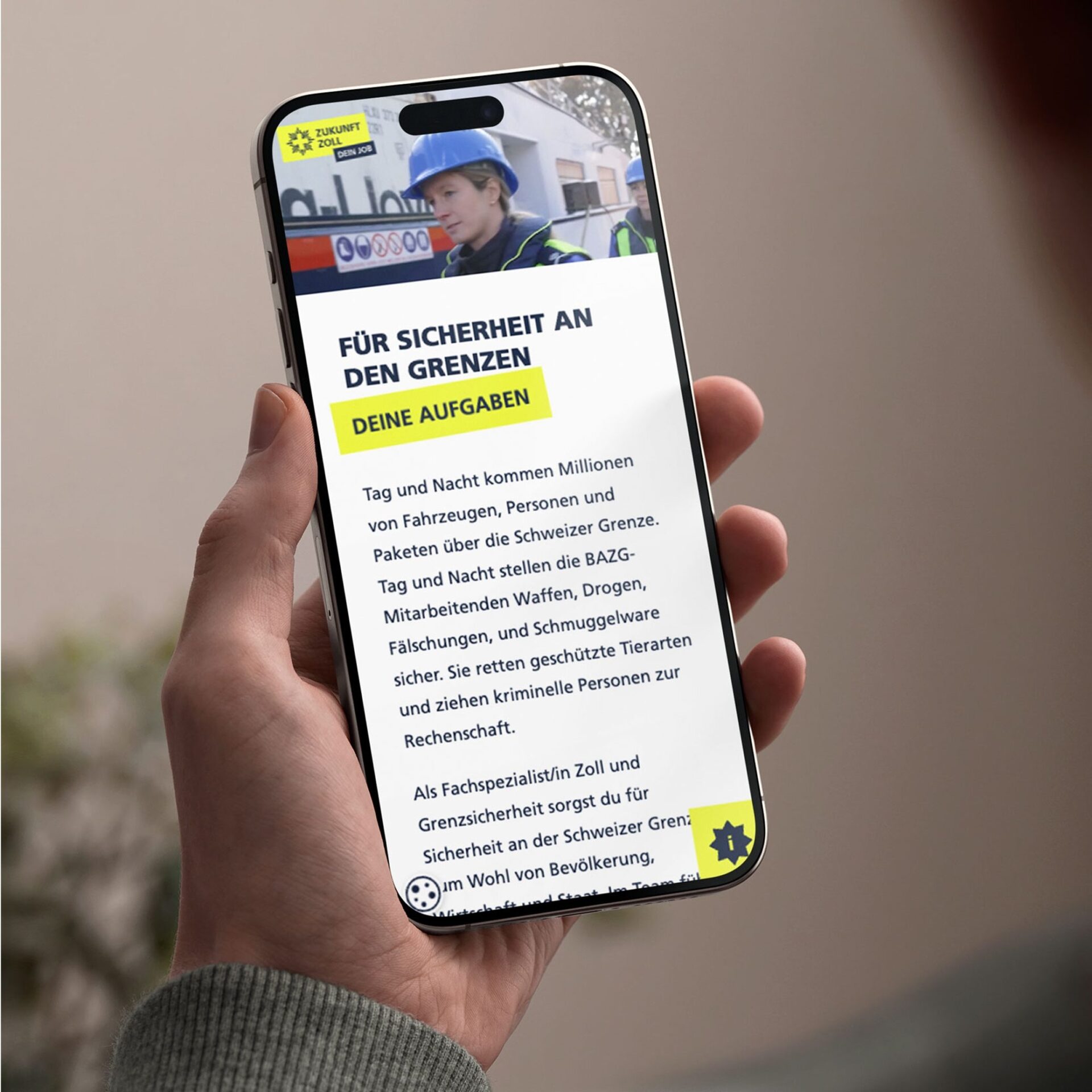 Die Realität sieht nämlich um einiges spannender aus. Fachspezialist/in Zoll- und Grenzsicherheit ist ein neuer Beruf mit Zukunft. Und um die Leitidee «Zukunft Zoll» dreht sich die Recruiting-Kampagne, die wir für das Bundesamt für Zoll und Grenzsicherheit BAZG konzipieren und umsetzen durften.